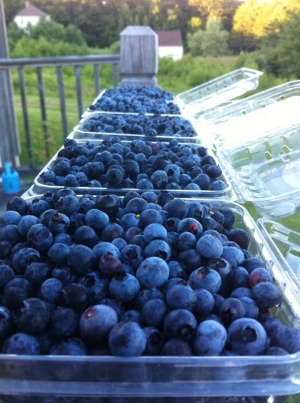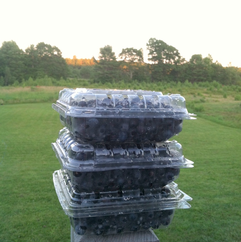 We saved containers from raspberries and blueberries that we bought last year at the grocery to use for this year’s blueberry harvest — smart thinking! — and they fill up fast! For the next few days we’ll be picking berries like mad:)